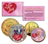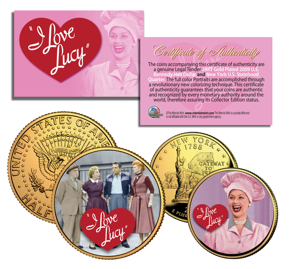 This Officially Licensed I LOVE LUCY 2-coin complete set is a treasured collectible, combining the popularity of the I LOVE LUCY legendary TV series with coin collecting. Coins are Genuine Authentic Legal Tender of the United States, which have been layered in Genuine 24 Karat Gold, and then beautifully enhanced with colorized images. The 2-coin set includes a 24-Karat Gold Plated JFK Kennedy Half Dollar coin with a colorized image of an I Love Lucy cast scene plus a 24-Karat Gold Plated 2001 New York Statehood quarter with a colorized image of Lucy in the Chocolate scene. New York was Lucille Ball’s birthplace state. Colorizing coins involves the unique application of special inks directly to the surface of a coin that achieves a level of detail, color saturation, and durability that is #1 in the coin industry. The result is an everlasting colorized coin collectible of ultra-high quality. Each coin comes in a premium coin capsule. The set comes with a Certificate of Authenticity to guarantee that your coins are authentic and recognized by every monetary authority around the world, assuring its Collector Edition status.