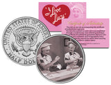 Here is your opportunity to own or to gift, a beautifully colorized JFK Kennedy Half Dollar U.S. Coin, which has been enhanced with a scene image from an episode of the I LOVE LUCY legendary TV series. Each OFFICIALLY LICENSED coin comes in a premium coin capsule with a full color Certificate of Authenticity. This Legal Tender United States coin has been colorized with an application of special inks directly to the surface of the coin, using a unique and painstakingly multicolor coin process, which achieves a level of detail, color saturation, and durability that is #1 in the coin industry. The result is an everlasting colorized coin collectible of ultra-high quality. The Kennedy half dollar is a U.S. fifty cent coin with coin year and mint marks chosen at random.