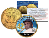 This BASEBALL LEGENDS – JACK ROBINSON “Jackie 42 2B" coin is a treasured collectible, successfully combining baseball with coin collecting. Here is your opportunity to own or to gift, a beautifully colorized JFK Kennedy Half Dollar U.S. Coin, which has been layered in Genuine 24 Karat Gold, and then enhanced with a beautiful colorized image by the Merrick Mint. Each coin comes in a premium coin capsule with a full color Certificate of Authenticity. This Legal Tender United States coin has been colorized with an application of special inks directly to the surface of the coin, using a unique and painstakingly multicolor coin process, which achieves a level of detail, color saturation, and durability that is #1 in the coin industry. The result is an everlasting colorized coin collectible of ultra-high quality. The Kennedy half dollar is a U.S. fifty cent coin with coin year and mint marks chosen at random