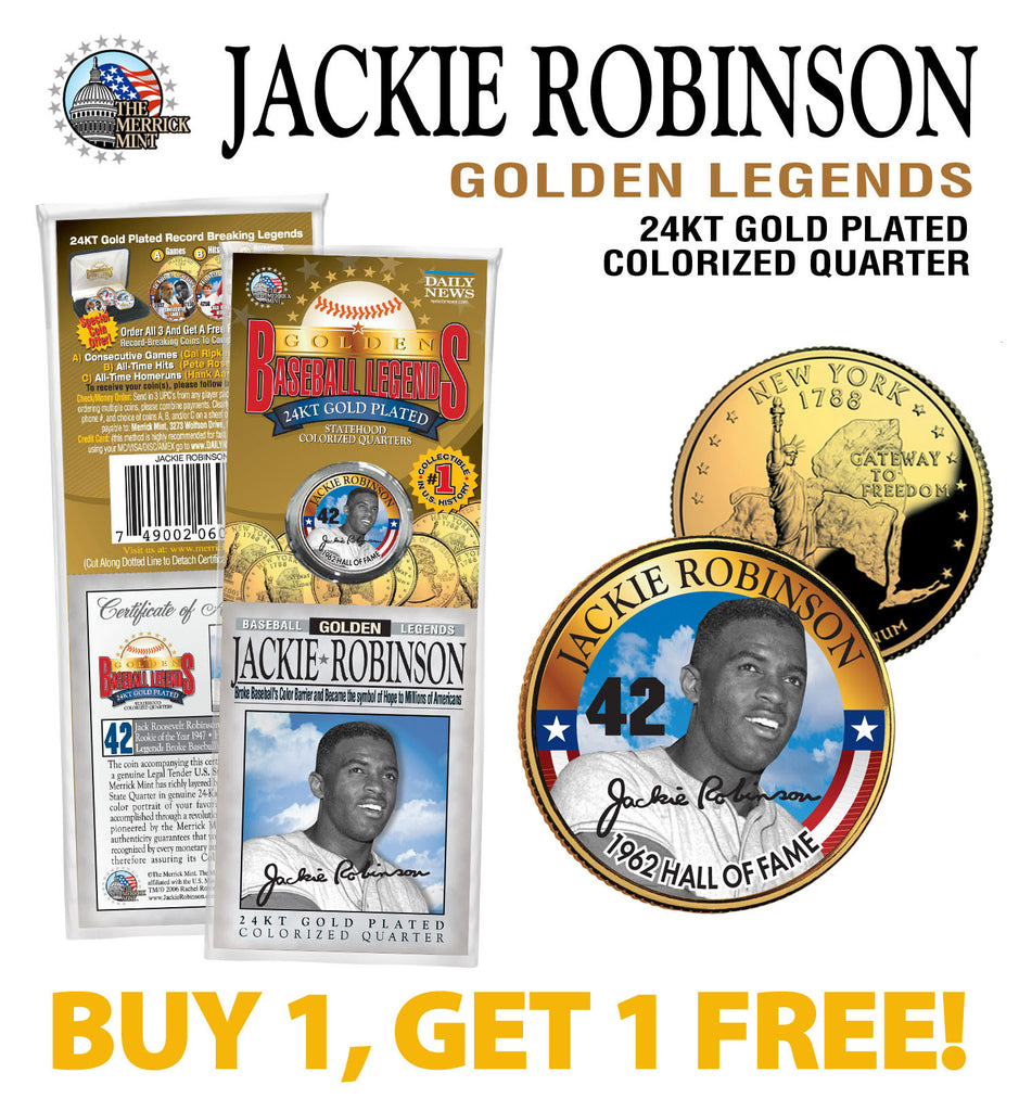 Buy one and get one FREE! This GOLDEN BASEBALL LEGENDS – JACKIE ROBINSON “1962 HALL OF FAME 42" coin is a treasured collectible, successfully combining baseball with coin collecting. Here is your opportunity to own or to gift, a beautifully colorized 2001 New York Quarter U.S. coin, which has been layered in Genuine 24 Karat Gold, and then enhanced with a beautiful colorized image by the Merrick Mint. This hard-to-find, cello-packed collectible was only available as a NY Daily News newspaper promotion. Each coin comes in a premium coin capsule with a Certificate of Authenticity to guaranty that your coin is authentic and recognized by every monetary authority around the world, assuring its Collector Edition status. This Legal Tender United States coin has been colorized with an application of special inks directly to the surface of the coin, using a unique and painstakingly multicolor coin process, which achieves a level of detail, color saturation, and durability that is #1 in the coin industry. The result is an everlasting colorized coin collectible of ultra-high quality. Each Statehood Quarter coin features an emblematic design of the state on the reverse and colorized player image on the obverse (portrait of George Washington design).