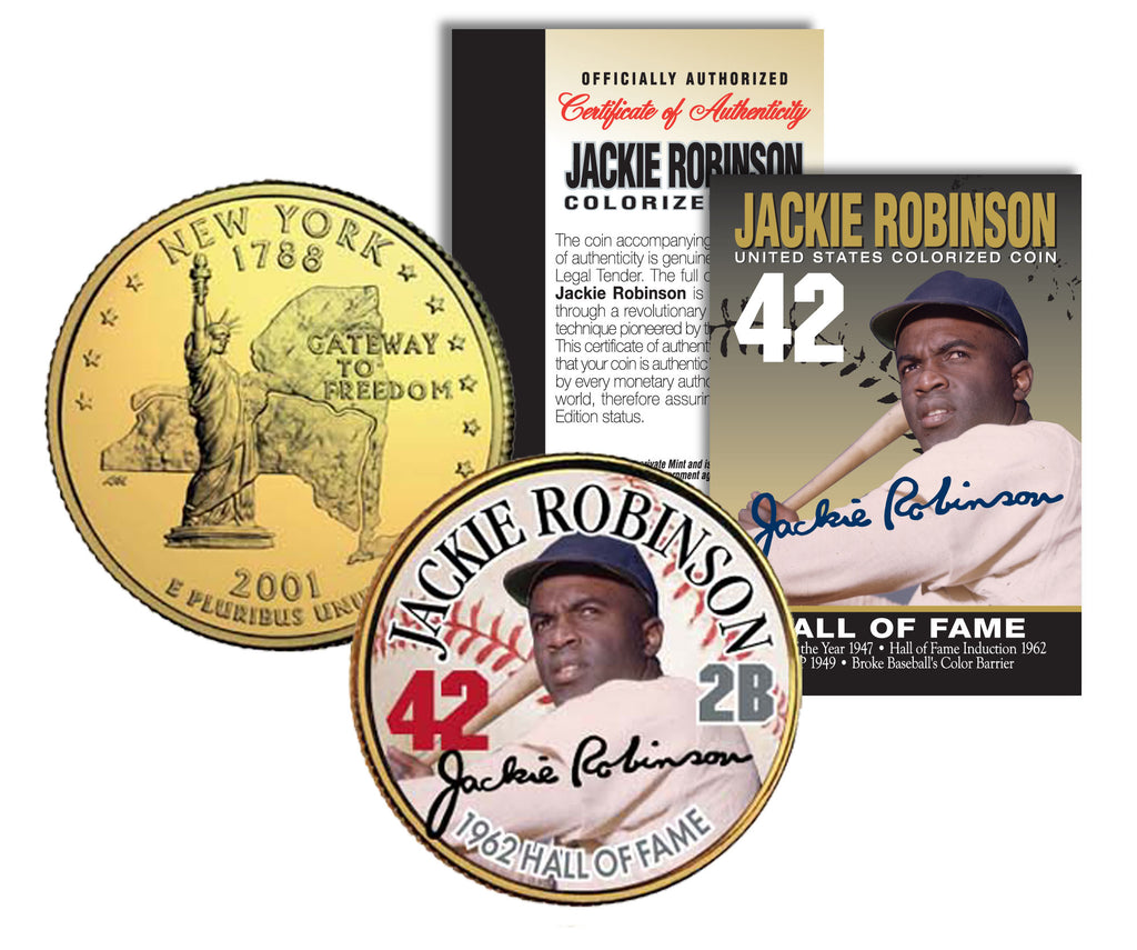 This JACKIE ROBINSON BASEBALL LEGEND – HALL OF FAME rare coin is a treasured collectible, successfully combining baseball with coin collecting. Here is your opportunity to own or to gift, a beautifully colorized 2001 New York Statehood Quarter U.S. Coin, which has been layered in Genuine 24 Karat Gold, and then enhanced with a beautiful colorized image by the Merrick Mint. Each coin comes in a premium coin capsule with a rare baseball card size, 2.5” x 3.5”, full color Certificate of Authenticity to guaranty that your coin is authentic and recognized by every monetary authority around the world, assuring its Collector Edition status. This Legal Tender United States coin has been colorized with an application of special inks directly to the surface of the coin, using a unique and painstakingly multicolor coin process, which achieves a level of detail, color saturation, and durability that is #1 in the coin industry. The result is an everlasting colorized coin collectible of ultra-high quality. Each Statehood Quarter coin features an emblematic design of New York State on the reverse and a colorized image of JACKIE ROBINSON on the obverse (portrait of George Washington design).