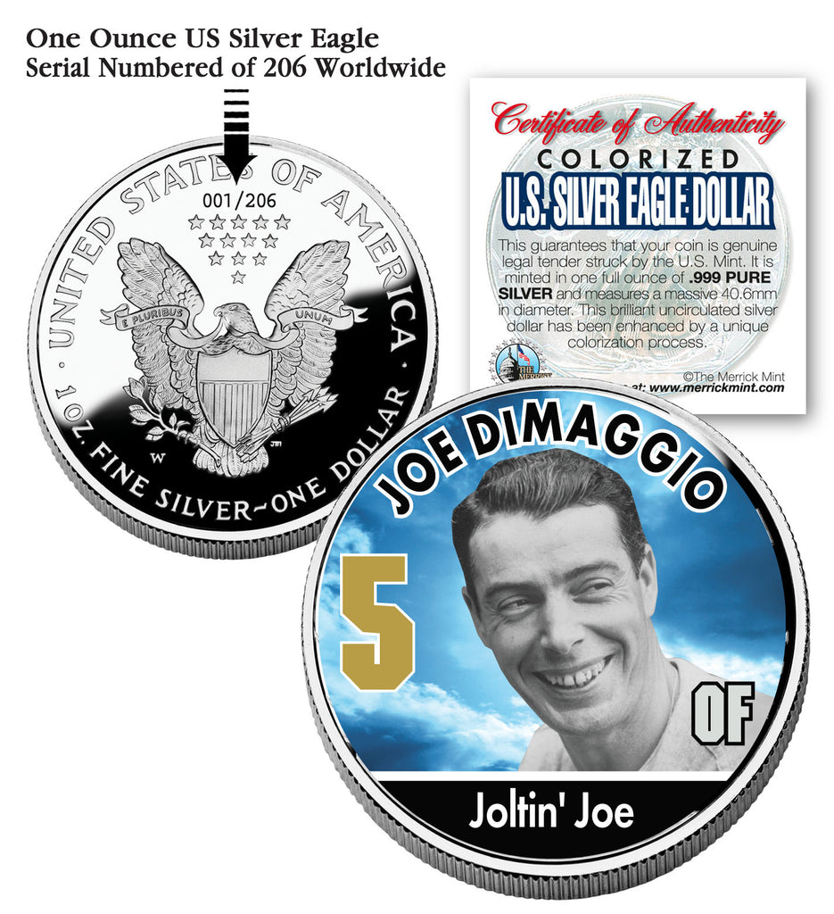 The officially licensed JOE DIMAGGIO colorized 2006 U.S. Silver Eagle Dollar coin is genuine legal tender struck by the U.S. Mint. It is minted in one full ounce of .999 PURE SILVER and measures a massive 40.6mm in diameter. This brilliant uncirculated silver dollar has been enhanced by a unique colorization process. Each coin is a limited edition and serial numbered of 206 on the coin reverse. Each coin comes in a premium coin capsule with a Certificate of Authenticity. Due to the age of the coin, there may be some toning which is a natural effect of .999 Pure Silver coins.