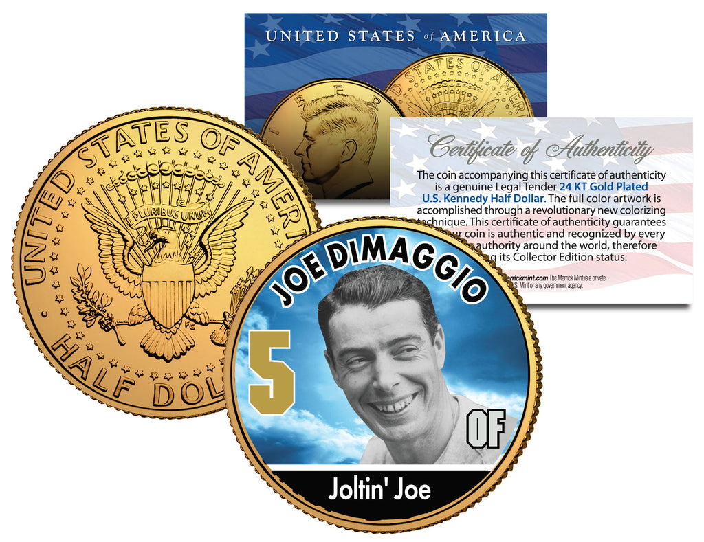 This BASEBALL LEGENDS – JOE DIMAGGIO “Joltin' Joe 5 OF” coin is a treasured collectible, successfully combining baseball with coin collecting. Here is your opportunity to own or to gift, a beautifully colorized JFK Kennedy Half Dollar U.S. Coin, which has been layered in Genuine 24 Karat Gold, and then enhanced with a beautiful colorized image by the Merrick Mint. Each coin comes in a premium coin capsule with a full color Certificate of Authenticity. This Legal Tender United States coin has been colorized with an application of special inks directly to the surface of the coin, using a unique and painstakingly multicolor coin process, which achieves a level of detail, color saturation, and durability that is #1 in the coin industry. The result is an everlasting colorized coin collectible of ultra-high quality. The Kennedy half dollar is a U.S. fifty cent coin with coin year and mint marks chosen at random.