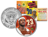 This LEBRON JAMES PRE-ROOKIE HALF DOLLAR coin is a treasured collectible, successfully combining basketball with coin collecting. Here is your opportunity to own or to gift, a beautifully colorized JFK Kennedy Half Dollar, enhanced with a beautiful colorized image of LeBron James including his pre-rookie facsimile signature. The coin is fully licensed & authorized by Upper Deck and LeBron James. Each coin comes in a premium coin capsule with a Certificate of Authenticity to guaranty that your coin is authentic and recognized by every monetary authority around the world, assuring its Collector Edition status. This uncirculated Legal Tender United States coin has been colorized with an application of special inks directly to the surface of the coin, using a unique and painstakingly multicolor coin process, which achieves a level of detail, color saturation, and durability that is #1 in the coin industry. The result is an everlasting colorized coin collectible of ultra-high quality. The Kennedy half dollar is a U.S. fifty cent coin with coin year and mint marks chosen at random.