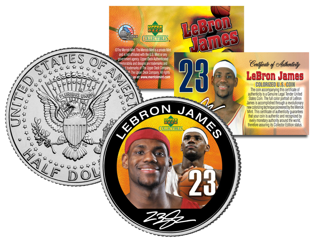 This LEBRON JAMES ROOKIE HALF DOLLAR coin is a treasured collectible, successfully combining basketball with coin collecting. Here is your opportunity to own or to gift, a beautifully colorized JFK Kennedy Half Dollar, enhanced with a beautiful colorized image of LeBron James including his rookie facsimile signature. The coin is fully licensed & authorized by Upper Deck and LeBron James. Each coin comes in a premium coin capsule with a Certificate of Authenticity to guaranty that your coin is authentic and recognized by every monetary authority around the world, assuring its Collector Edition status. This uncirculated Legal Tender United States coin has been colorized with an application of special inks directly to the surface of the coin, using a unique and painstakingly multicolor coin process, which achieves a level of detail, color saturation, and durability that is #1 in the coin industry. The result is an everlasting colorized coin collectible of ultra-high quality. The Kennedy half dollar is a U.S. fifty cent coin with coin year and mint marks chosen at random.