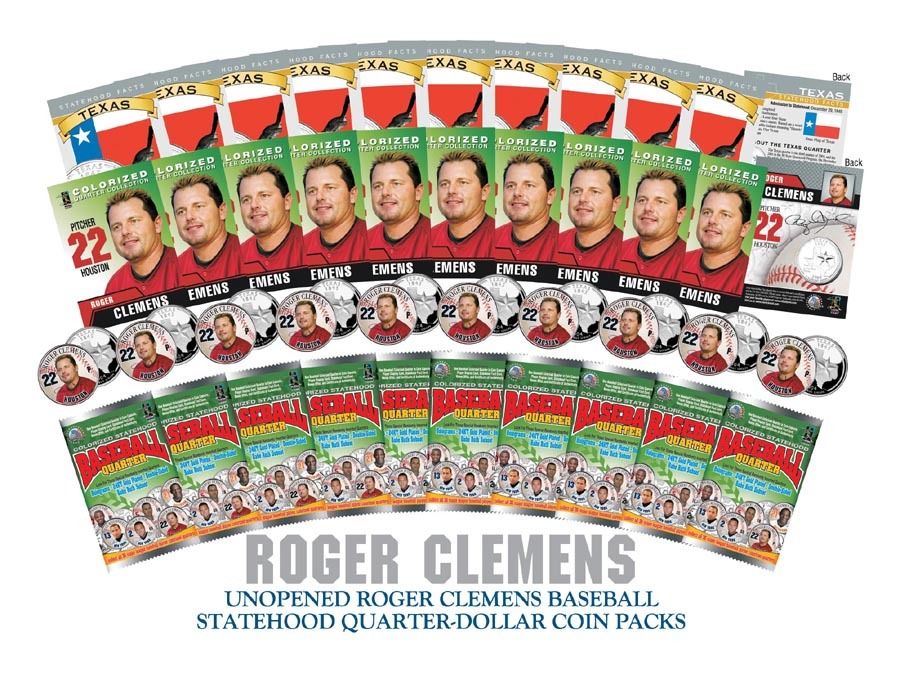 Here is your chance to get a great deal with huge savings of up to 85% off. You will receive ten (10) factory-sealed unopened packs of ROGER CLEMENS Baseball Statehood Quarters. Each pack contains the player Quarter with Capsule, the players 2-Sided Trading Card, Statehood Quarter 2-Sided Trading Fact Card, and a Certificate of Authenticity. These high-quality, genuine Legal Tender 2004 Texas Quarters U.S. coins have been colorized with Roger Clemens’ image using a unique painstaking multicolor authentic process by The Merrick Mint. Colorizing coins involves the unique application of special inks directly to the surface of a coin that achieves a level of detail, color saturation, and durability that is #1 in the coin industry. The result is an everlasting colorized coin collectible of ultra-high quality.