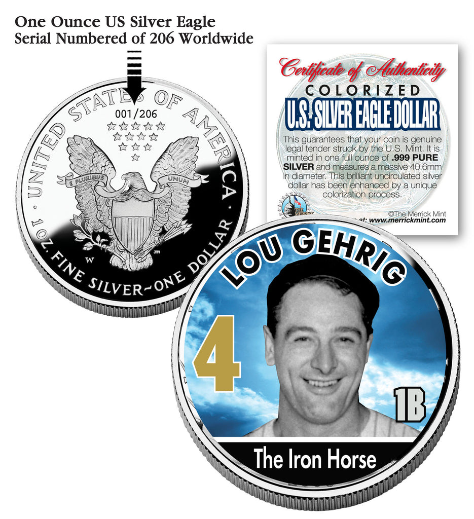 The officially licensed LOU GEHRIG colorized 2006 U.S. Silver Eagle Dollar coin is genuine legal tender struck by the U.S. Mint. It is minted in one full ounce of .999 PURE SILVER and measures a massive 40.6mm in diameter. This brilliant uncirculated silver dollar has been enhanced by a unique colorization process. Each coin is a limited edition and serial numbered of 206 on the coin reverse. Each coin comes in a premium coin capsule with a Certificate of Authenticity. Due to the age of the coin, there may be some toning which is a natural effect of .999 Pure Silver coins.