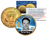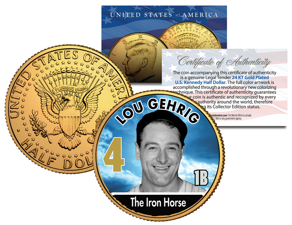 This BASEBALL LEGENDS – LOU GEHRIG “The Iron Horse 4 1B” coin is a treasured collectible, successfully combining baseball with coin collecting. Here is your opportunity to own or to gift, a beautifully colorized JFK Kennedy Half Dollar U.S. Coin, which has been layered in Genuine 24 Karat Gold, and then enhanced with a beautiful colorized image by the Merrick Mint. Each coin comes in a premium coin capsule with a full color Certificate of Authenticity. This Legal Tender United States coin has been colorized with an application of special inks directly to the surface of the coin, using a unique and painstakingly multicolor coin process, which achieves a level of detail, color saturation, and durability that is #1 in the coin industry. The result is an everlasting colorized coin collectible of ultra-high quality. The Kennedy half dollar is a U.S. fifty cent coin with coin year and mint marks chosen at random.