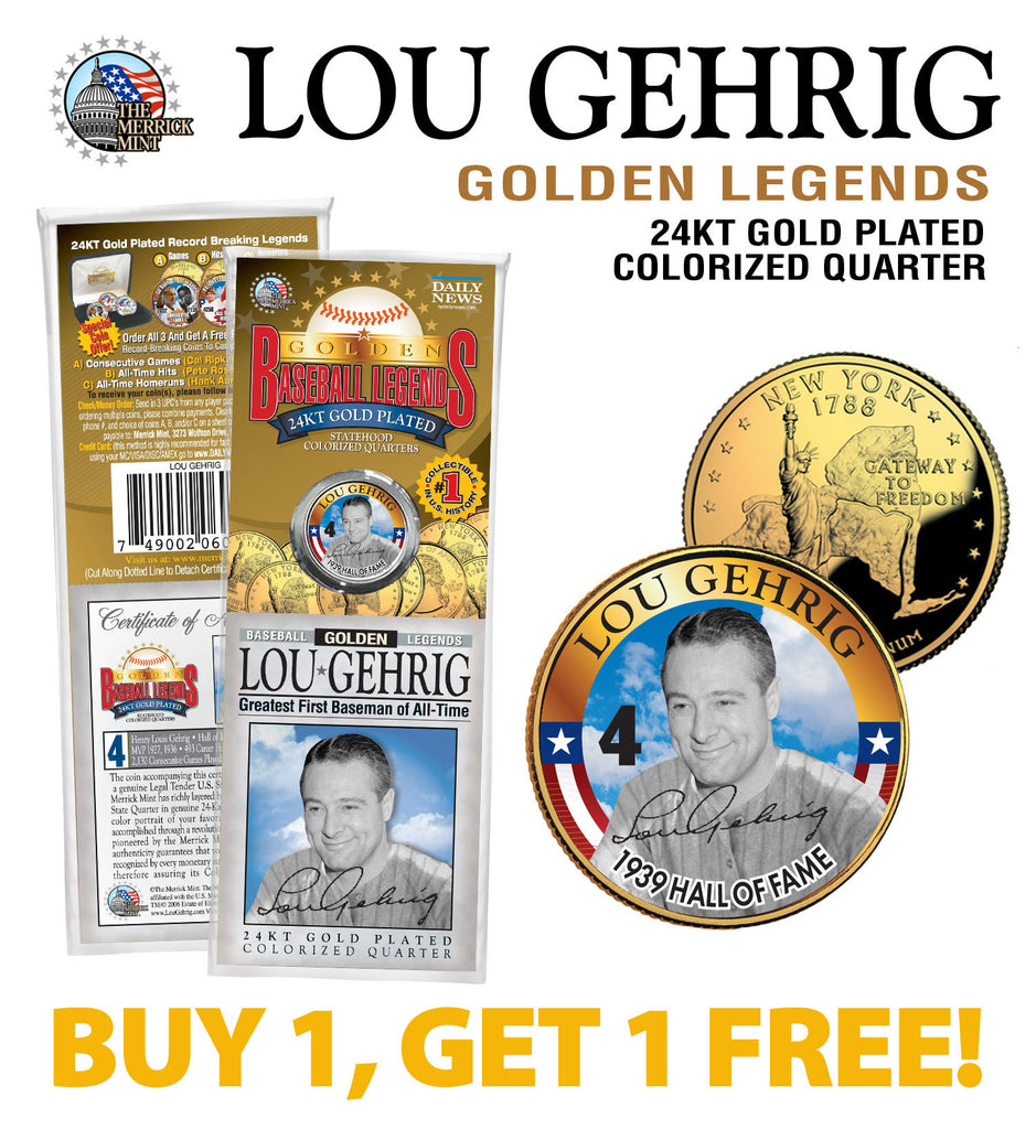 Buy one and get one FREE! This GOLDEN BASEBALL LEGENDS – LOU GEHRIG “1939 HALL OF FAME 4" coin is a treasured collectible, successfully combining baseball with coin collecting. Here is your opportunity to own or to gift, a beautifully colorized 2001 New York Quarter U.S. coin, which has been layered in Genuine 24 Karat Gold, and then enhanced with a beautiful colorized image by the Merrick Mint. This hard-to-find, cello-packed collectible was only available as a NY Daily News newspaper promotion. Each coin comes in a premium coin capsule with a Certificate of Authenticity to guaranty that your coin is authentic and recognized by every monetary authority around the world, assuring its Collector Edition status. This Legal Tender United States coin has been colorized with an application of special inks directly to the surface of the coin, using a unique and painstakingly multicolor coin process, which achieves a level of detail, color saturation, and durability that is #1 in the coin industry. The result is an everlasting colorized coin collectible of ultra-high quality. Each Statehood Quarter coin features an emblematic design of the state on the reverse and colorized player image on the obverse (portrait of George Washington design).