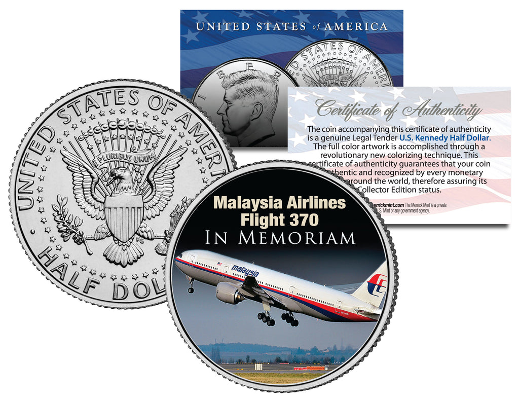 Malaysia Airlines Flight 370 was a scheduled international passenger flight traveling from Kuala Lumpur to Beijing that went missing on 8 March 2014. Here is your opportunity to own the MAYLASIA AIRLINES FLIGHT 370 – IN MEMORIAM collectible coin. This colorized JFK Kennedy Half Dollar U.S. Coin has been enhanced with a colorized image by the Merrick Mint. Each coin comes in a premium coin capsule with a full color Certificate of Authenticity. This Legal Tender United States coin has been colorized with an application of special inks directly to the surface of the coin, using a unique and painstakingly multicolor coin process, which achieves a level of detail, color saturation, and durability that is #1 in the coin industry. The result is an everlasting colorized coin collectible of ultra-high quality. The Kennedy half dollar is a U.S. fifty cent coin with coin year and mint marks chosen at random.