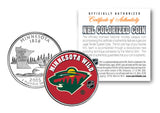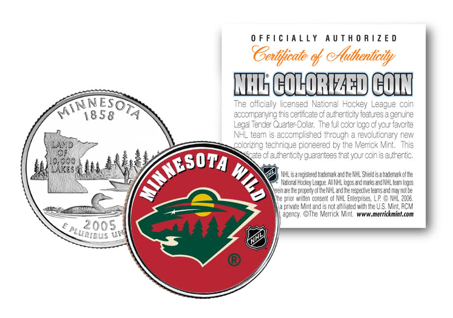 Here is your chance to own an OFFICIALLY LICENSED, beautifully colorized Legal Tender 2005 Minnesota Statehood Quarter U.S. coin that is beautifully colorized with the licensed NHL logo image of your favorite NHL team, the MINNESOTA WILD. Each coin is officially licensed and approved by the National Hockey League (NHL). This uncirculated Genuine Legal Tender Statehood Quarter U.S. Coin has been colorized using a unique multicolor authentic process by the Merrick Mint. Colorizing coins involves the unique application of special inks directly to the surface of a coin using a unique and painstakingly multi-color coin process, that achieves a level of detail, color saturation, and durability that is #1 in the industry. The result is an everlasting colorized coin collectible of ultra-high quality. Each uncirculated coin comes in a premium coin capsule with a NHL Certificate of Authenticity. Each Statehood Quarter coin features an emblematic design of the state on the reverse and colorized NHL team logo image on the obverse (portrait of George Washington design).