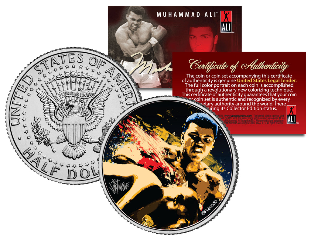 This Officially Licensed “MUHAMMAD ALI – ARTISTIC KNOCKOUT” coin is a treasured collectible, successfully combining boxing with coin collecting. Here is your opportunity to own or to gift, a beautifully colorized JFK Kennedy Half Dollar U.S. Coin. This Legal Tender United States coin has been colorized with an application of special inks directly to the surface of the coin, using a unique and painstakingly multicolor coin process, which achieves a level of detail, color saturation, and durability that is #1 in the coin industry. The result is an everlasting colorized coin collectible of ultra-high quality. Each coin comes in a premium coin capsule with a Certificate of Authenticity to guaranty that your coin is authentic and recognized by every monetary authority around the world, assuring its Collector Edition status. The Kennedy half dollar is a U.S. fifty cent coin with coin year and mint marks chosen at random.