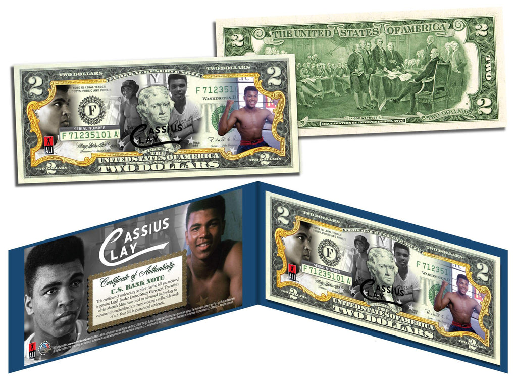 This Officially Licensed MUHAMMAD ALI - CASSIUS CLAY uncirculated U.S. $2 Bill is Genuine Authentic Legal Tender of the United States, which has been enhanced with colorized images of a young Muhammad Ali. The colorized images are accomplished through a revolutionary new authentic & genuine colorization process pioneered by The Merrick Mint, creating a collectible work of art. Each bill comes displayed in a blue folio with a Certificate of Authenticity to guarantee that your bills are authentic and recognized by every monetary authority around the world, therefore assuring its Collector Edition status. Each $2 Bill is in FRESH, CRISP, UNCIRCULATED condition, and was directly removed from untouched wrapped Federal Reserve sealed packs. Former U.S. President Thomas Jefferson is featured on the obverse of the note, along with the special colorization overlay. The Signing of the Declaration of Independence by John Trumbull is featured on the reverse. It is the only U.S. Currency note that features two Presidents, John Adams and Thomas Jefferson, and it is one of the most rarely seen BILLS in circulation and actual use.