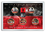 This officially licensed “THE LIFE & TIMES OF MUHAMMAD ALI” colorized 24KT Gold Plated US Statehood Quarter 5-Coin Set is The Ultimate Collection. Each genuine legal tender coin has been layered in genuine 24 Karat Gold, and then colorized on the obverse with beautiful images of Muhammad Ali, celebrating 5 periods in Ali’s life. In the 5-coin set, there are two 2001 Kentucky Statehood coins plus one each of: 2006 Nevada, 2001 New York, and 2002 Louisiana. Colorizing coins involves the unique application of special inks directly to the surface of a coin that achieves a level of detail, color saturation, and durability that is #1 in the industry. The result is an everlasting colorized coin collectible of ultra-high quality. The 5-Coin Set comes displayed on a die-cut display with beautiful artwork sealed in acrylic airtight case.