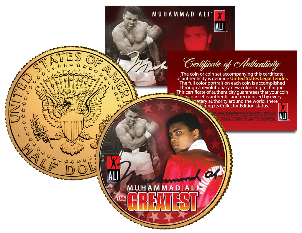 Muhammad Ali proclaimed himself "The Greatest" and proved it as a 3-Time Heavyweight World Champion. This Officially Licensed “MUHAMMAD ALI – THE GREATEST” coin is a treasured collectible, successfully combining boxing with coin collecting. Here is your opportunity to own or to gift, a beautifully colorized JFK Kennedy Half Dollar U.S. Coin, which has been layered in Genuine 24 Karat Gold, and then enhanced with a beautiful colorized image by the Merrick Mint. This Legal Tender United States coin has been colorized with an application of special inks directly to the surface of the coin, using a unique and painstakingly multicolor coin process, which achieves a level of detail, color saturation, and durability that is #1 in the coin industry. The result is an everlasting colorized coin collectible of ultra-high quality. Each coin comes in a premium coin capsule with a Certificate of Authenticity to guaranty that your coin is authentic and recognized by every monetary authority around the world, assuring its Collector Edition status. The Kennedy half dollar is a U.S. fifty cent coin with coin year and mint marks chosen at random.