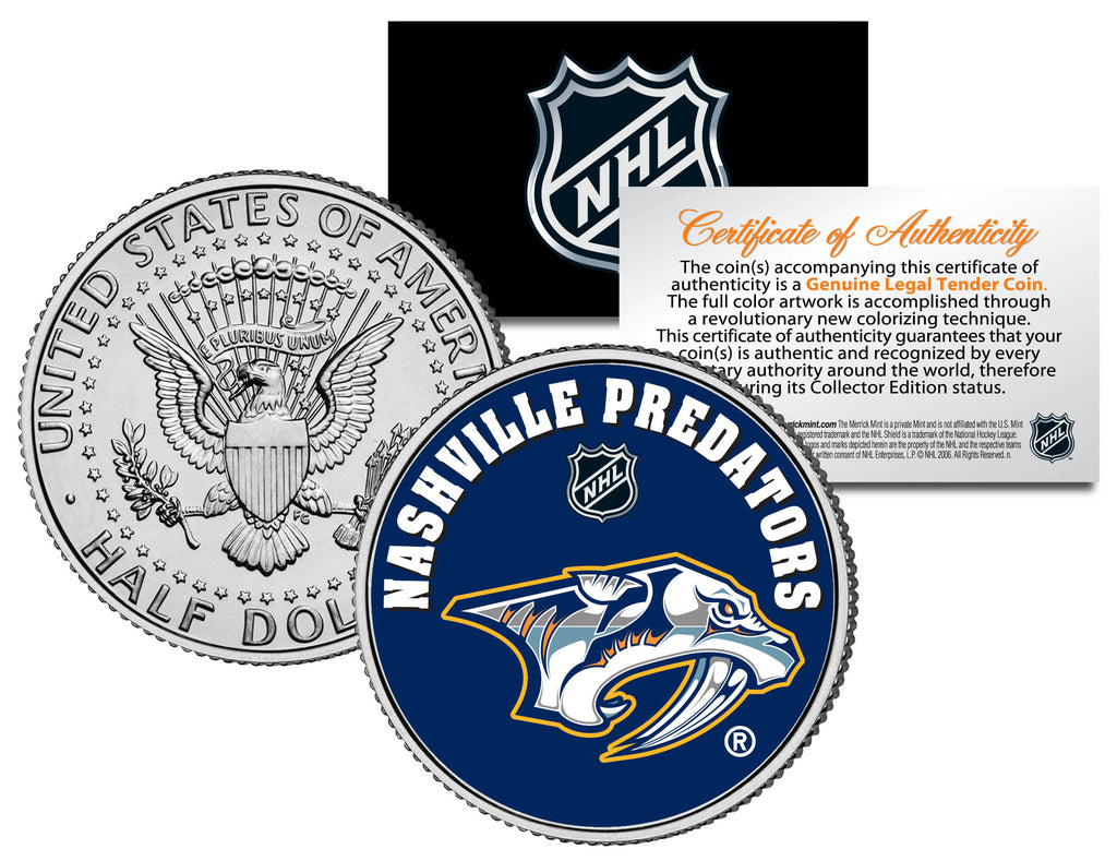 Here is your chance to own a JFK Kennedy Half Dollar U.S. coin that is beautifully colorized with the licensed NHL logo image of your favorite NHL team, the NASHVILLE PREDATORS. Each coin is officially licensed and approved by the National Hockey League (NHL). This high-quality genuine Legal Tender U.S. coin has been colorized using a unique painstaking multicolor authentic process by the Merrick Mint. Colorizing coins involves the unique application of special inks directly to the surface of a coin that achieves a level of detail, color saturation, and durability that is #1 in the coin industry. The result is an everlasting colorized coin collectible of ultra-high quality. Each uncirculated coin comes in a premium coin capsule with a NHL Certificate of Authenticity. The Kennedy half dollar is a U.S. fifty cent coin with coin year and mint marks chosen at random.