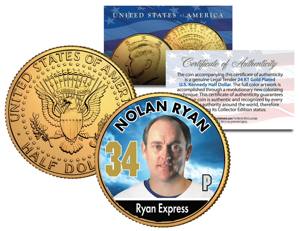 This BASEBALL LEGENDS – NOLAN RYAN “Ryan Express 34 P” coin is a treasured collectible, successfully combining baseball with coin collecting. Here is your opportunity to own or to gift, a beautifully colorized JFK Kennedy Half Dollar U.S. Coin, which has been layered in Genuine 24 Karat Gold, and then enhanced with a beautiful colorized image by the Merrick Mint. Each coin comes in a premium coin capsule with a full color Certificate of Authenticity. This Legal Tender United States coin has been colorized with an application of special inks directly to the surface of the coin, using a unique and painstakingly multicolor coin process, which achieves a level of detail, color saturation, and durability that is #1 in the coin industry. The result is an everlasting colorized coin collectible of ultra-high quality. The Kennedy half dollar is a U.S. fifty cent coin with coin year and mint marks chosen at random.