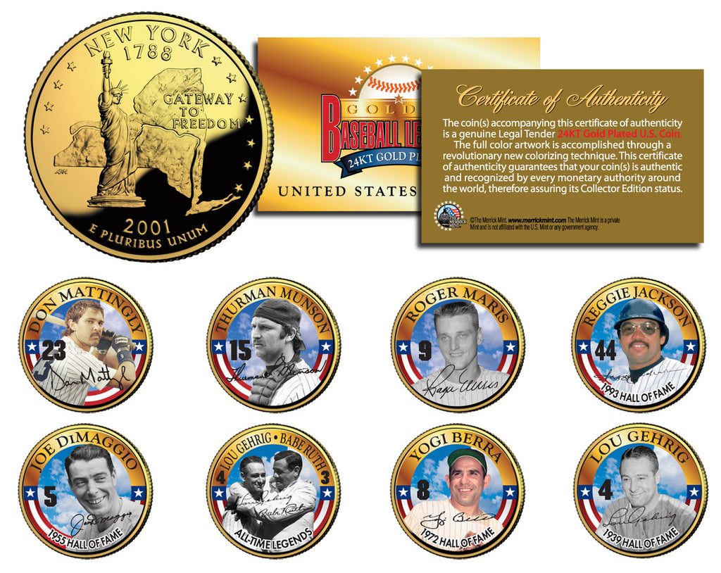 The New York Yankees are regarded by many as the world’s greatest sports franchise. Here is your chance to own a complete set of eight (8) 24KT Gold Plated and colorized 2001 New York Statehood Quarters U.S. Coins featuring 8 YANKEES GREATS, in this Limited Edition Coin Series. These high-quality, genuine Legal Tender United States coins have been layered in Genuine 24 Karat Gold, and then colorized using a unique painstaking multicolor authentic process by the Merrick Mint. Colorizing coins involves the unique application of special inks directly to the surface of a coin that achieves a level of detail, color saturation, and durability that is #1 in the coin industry. The result is an everlasting colorized coin collectible of ultra-high quality. Each 24KT Gold Plated coin features an emblematic design of New York state on the reverse and colorized images of YANKEES LEGENDS on the obverse (portrait of George Washington design). Each coin comes in a premium coin capsule with a Certificate of Authenticity. REGULAR PRICE of these 8-coins is $59.95. GREAT SAVINGS BY BUYING HERE NOW!!!