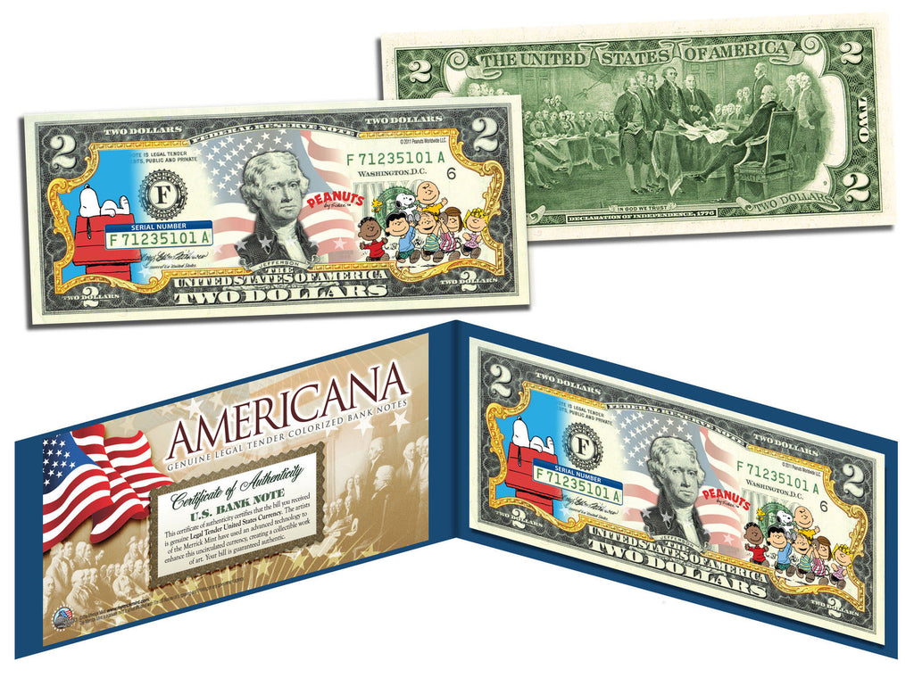 • PEANUTS - CHARLIE BROWN - SNOOPY - Americana - Genuine Legal Tender Colorized U.S. $2 Bill - Officially Licensed