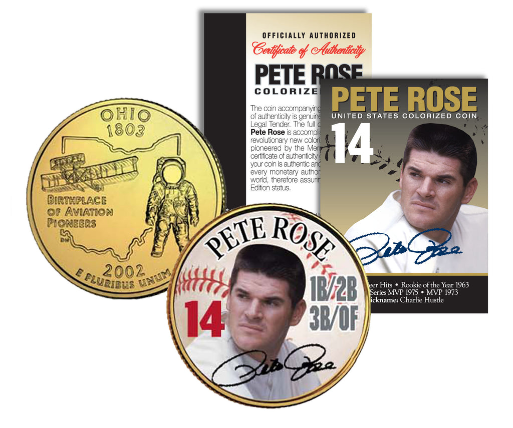 This PETE ROSE BASEBALL LEGEND – HALL OF FAME rare coin is a treasured collectible, successfully combining baseball with coin collecting. Here is your opportunity to own or to gift, a beautifully colorized 2002 Ohio Statehood Quarter U.S. Coin, which has been layered in Genuine 24 Karat Gold, and then enhanced with a beautiful colorized image by the Merrick Mint. Each coin comes in a premium coin capsule with a rare baseball card size, 2.5” x 3.5”, full color Certificate of Authenticity to guaranty that your coin is authentic and recognized by every monetary authority around the world, assuring its Collector Edition status. This Legal Tender United States coin has been colorized with an application of special inks directly to the surface of the coin, using a unique and painstakingly multicolor coin process, which achieves a level of detail, color saturation, and durability that is #1 in the coin industry. The result is an everlasting colorized coin collectible of ultra-high quality. Each Statehood Quarter coin features an emblematic design of Ohio State on the reverse and a colorized image of PETE ROSE on the obverse (portrait of George Washington design).