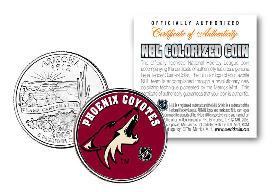 Here is your chance to own an OFFICIALLY LICENSED, beautifully colorized LEGAL TENDER 2008 ARIZONA Statehood Quarter U.S. coin that is beautifully colorized with the licensed NHL logo image of your favorite NHL team, the PHOENIX COYOTES. Each coin is officially licensed and approved by the National Hockey League (NHL). This uncirculated Genuine Legal Tender Statehood Quarter U.S. Coin has been colorized using a unique multicolor authentic process by the Merrick Mint. Colorizing coins involves the unique application of special inks directly to the surface of a coin using a unique and painstakingly multi-color coin process, that achieves a level of detail, color saturation, and durability that is #1 in the industry. The result is an everlasting colorized coin collectible of ultra-high quality. Each uncirculated coin comes in a premium coin capsule with a NHL Certificate of Authenticity. Each Statehood Quarter coin features an emblematic design of the state on the reverse and colorized NHL team logo image on the obverse (portrait of George Washington design).