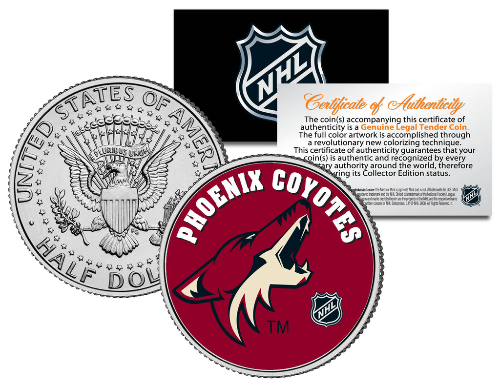 Here is your chance to own a JFK Kennedy Half Dollar U.S. coin that is beautifully colorized with the licensed NHL logo image of your favorite NHL team, the PHOENIX COYOTES. Each coin is officially licensed and approved by the National Hockey League (NHL). This high-quality genuine Legal Tender U.S. coin has been colorized using a unique painstaking multicolor authentic process by the Merrick Mint. Colorizing coins involves the unique application of special inks directly to the surface of a coin that achieves a level of detail, color saturation, and durability that is #1 in the coin industry. The result is an everlasting colorized coin collectible of ultra-high quality. Each uncirculated coin comes in a premium coin capsule with a NHL Certificate of Authenticity. The Kennedy half dollar is a U.S. fifty cent coin with coin year and mint marks chosen at random.