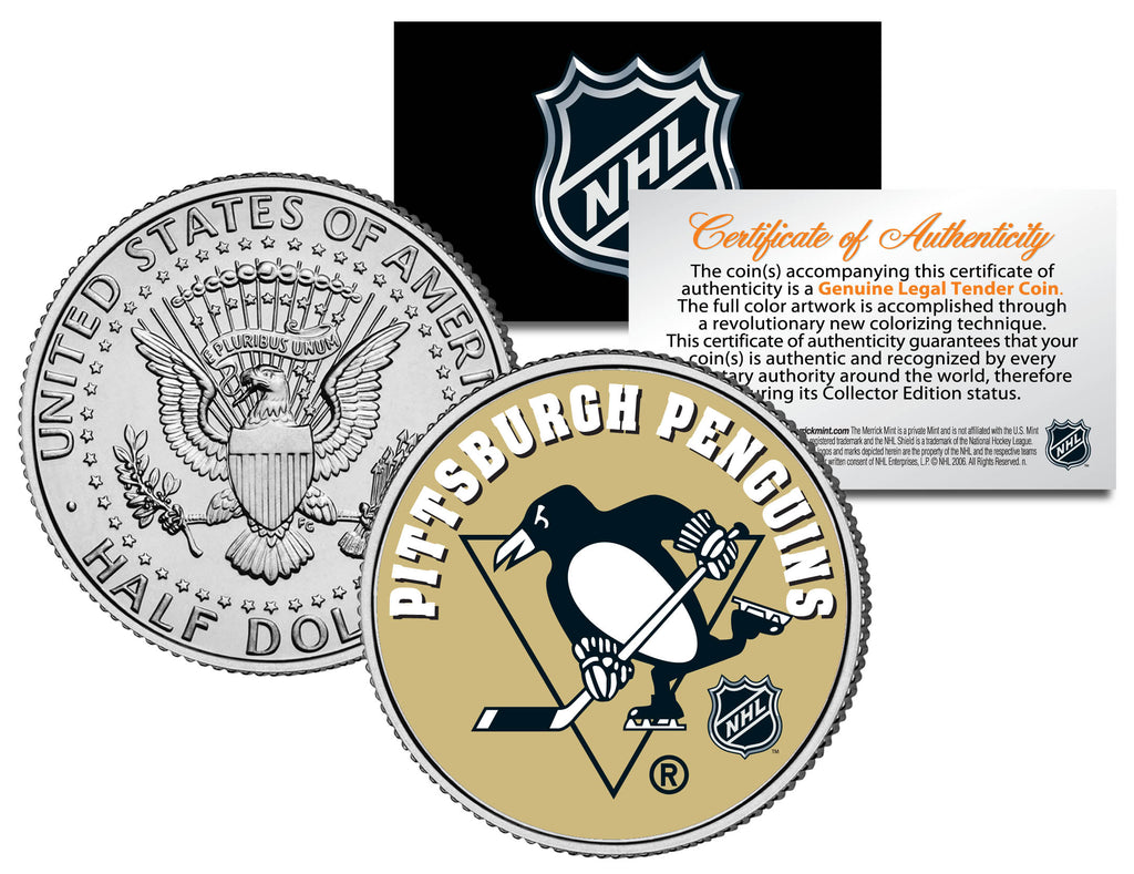 Here is your chance to own a JFK Kennedy Half Dollar U.S. coin that is beautifully colorized with the licensed NHL logo image of your favorite NHL team, the PITTSBURGH PENGUINS. Each coin is officially licensed and approved by the National Hockey League (NHL). This high-quality genuine Legal Tender U.S. coin has been colorized using a unique painstaking multicolor authentic process by the Merrick Mint. Colorizing coins involves the unique application of special inks directly to the surface of a coin that achieves a level of detail, color saturation, and durability that is #1 in the coin industry. The result is an everlasting colorized coin collectible of ultra-high quality. Each uncirculated coin comes in a premium coin capsule with a NHL Certificate of Authenticity. The Kennedy half dollar is a U.S. fifty cent coin with coin year and mint marks chosen at random.