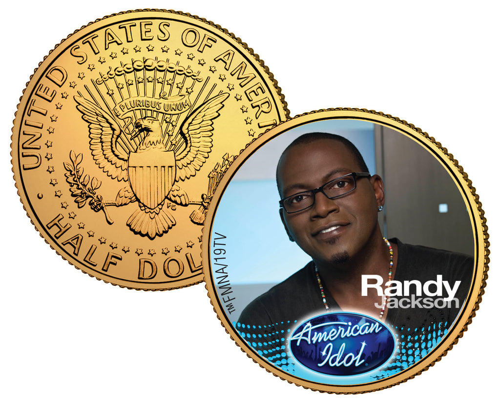 This 2009 AMERICAN IDOL - RANDY JACKSON coin is a treasured collectible, successfully combining American Idol with coin collecting. This 2009 Test Promo coin is in extreme short supply. Here is your opportunity to own or to gift, a beautifully colorized 2009 JFK Kennedy Half Dollar U.S. Coin, which has been layered in Genuine 24 Karat Gold, and then enhanced with a beautiful colorized image by the Merrick Mint. Each coin comes in a premium coin capsule. This Legal Tender United States coin has been colorized with an application of special inks directly to the surface of the coin, using a unique and painstakingly multicolor coin process, which achieves a level of detail, color saturation, and durability that is #1 in the coin industry. The result is an everlasting colorized coin collectible of ultra-high quality. The 2009 Kennedy half dollar is a U.S. fifty cent coin with coin mint marks chosen at random.
