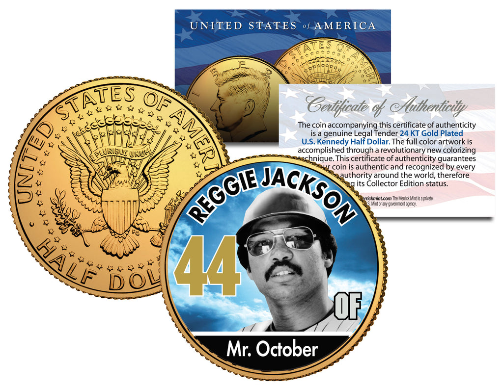 This BASEBALL LEGENDS – REGGIE JACKSON “Mr. October 44 OF” coin is a treasured collectible, successfully combining baseball with coin collecting. Here is your opportunity to own or to gift, a beautifully colorized JFK Kennedy Half Dollar U.S. Coin, which has been layered in Genuine 24 Karat Gold, and then enhanced with a beautiful colorized image by the Merrick Mint. Each coin comes in a premium coin capsule with a full color Certificate of Authenticity. This Legal Tender United States coin has been colorized with an application of special inks directly to the surface of the coin, using a unique and painstakingly multicolor coin process, which achieves a level of detail, color saturation, and durability that is #1 in the coin industry. The result is an everlasting colorized coin collectible of ultra-high quality. The Kennedy half dollar is a U.S. fifty cent coin with coin year and mint marks chosen at random.