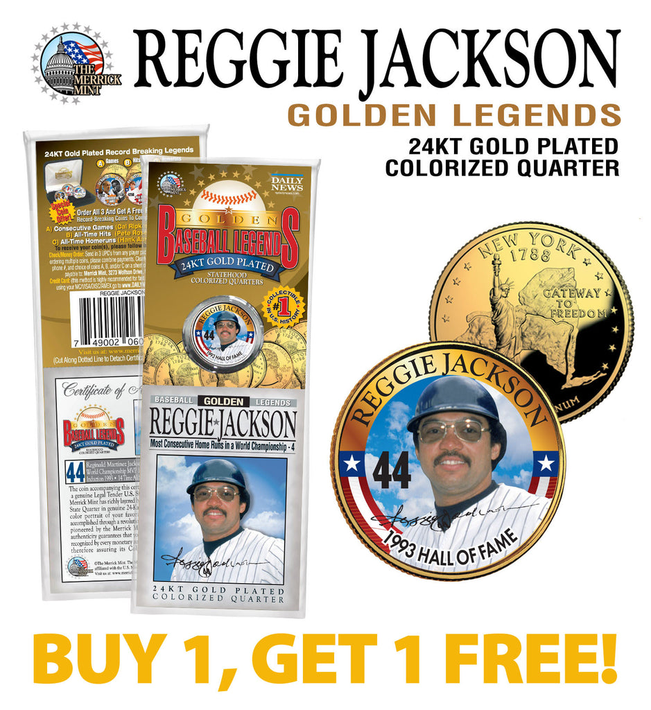 Buy one and get one FREE! This GOLDEN BASEBALL LEGENDS – REGGIE JACKSON “1993 HALL OF FAME 44" coin is a treasured collectible, successfully combining baseball with coin collecting. Here is your opportunity to own or to gift, a beautifully colorized 2001 New York Quarter U.S. coin, which has been layered in Genuine 24 Karat Gold, and then enhanced with a beautiful colorized image by the Merrick Mint. This hard-to-find, cello-packed collectible was only available as a NY Daily News newspaper promotion. Each coin comes in a premium coin capsule with a Certificate of Authenticity to guaranty that your coin is authentic and recognized by every monetary authority around the world, assuring its Collector Edition status. This Legal Tender United States coin has been colorized with an application of special inks directly to the surface of the coin, using a unique and painstakingly multicolor coin process, which achieves a level of detail, color saturation, and durability that is #1 in the coin industry. The result is an everlasting colorized coin collectible of ultra-high quality. Each Statehood Quarter coin features an emblematic design of the state on the reverse and colorized player image on the obverse (portrait of George Washington design).