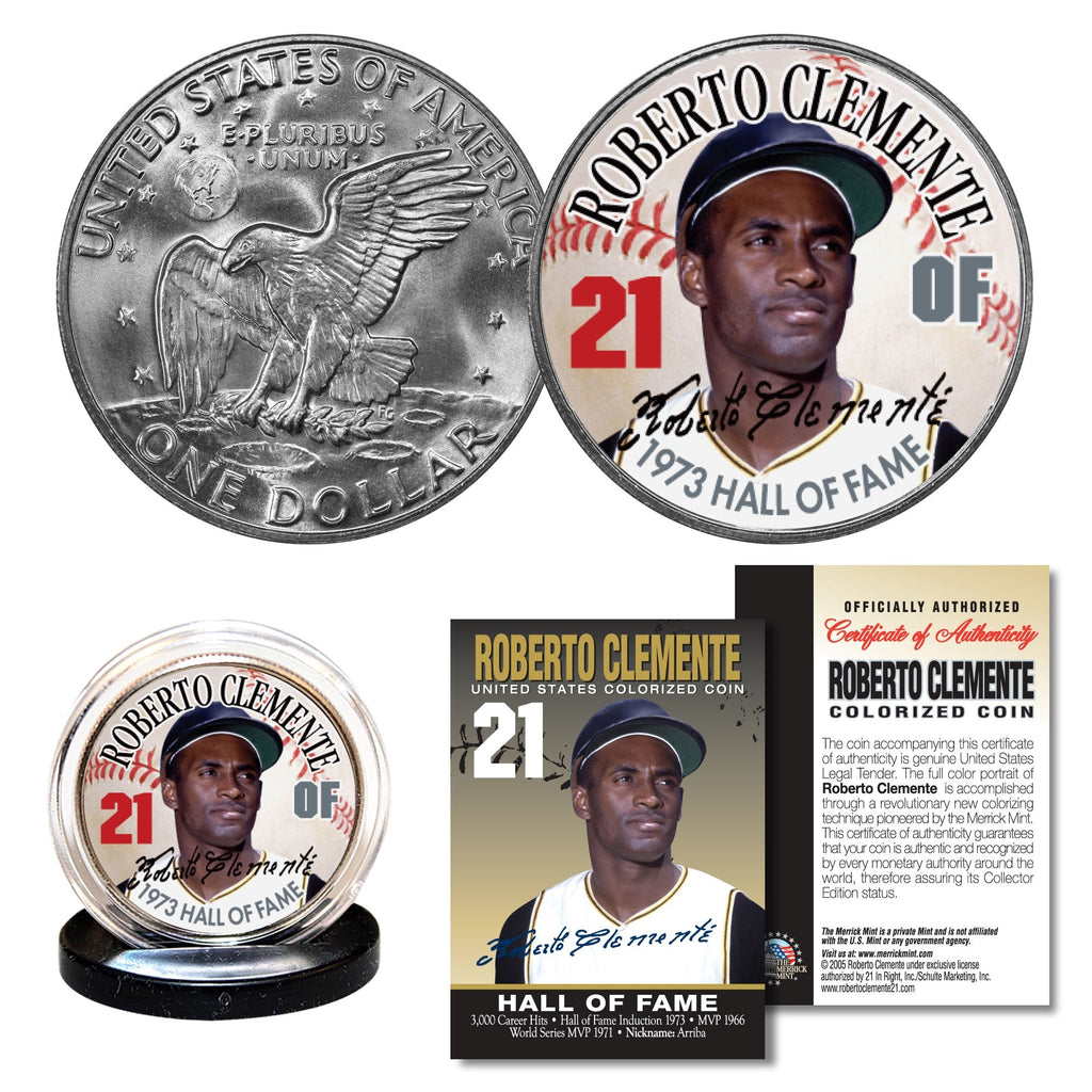 Clemente was inducted to the National Baseball Hall of Fame in 1973, becoming the first Latin American to be enshrined. He died in an aviation accident in 1972, while in route to deliver aid to earthquake victims in Nicaragua. Here is your opportunity to own or to gift the “ROBERTO CLEMENTE – 1973 HALL OF FAME - 21 OF” colorized 1972 IKE Eisenhower Dollar U.S. Coin, which has been enhanced with a beautifully colorized image by the Merrick Mint. Each coin comes in a premium coin capsule with a full color Certificate of Authenticity. This Legal Tender United States coin has been colorized with an application of special inks directly to the surface of the coin, using a unique and painstakingly multicolor coin process, which achieves a level of detail, color saturation, and durability that is #1 in the coin industry. The result is an everlasting colorized coin collectible of ultra-high quality.