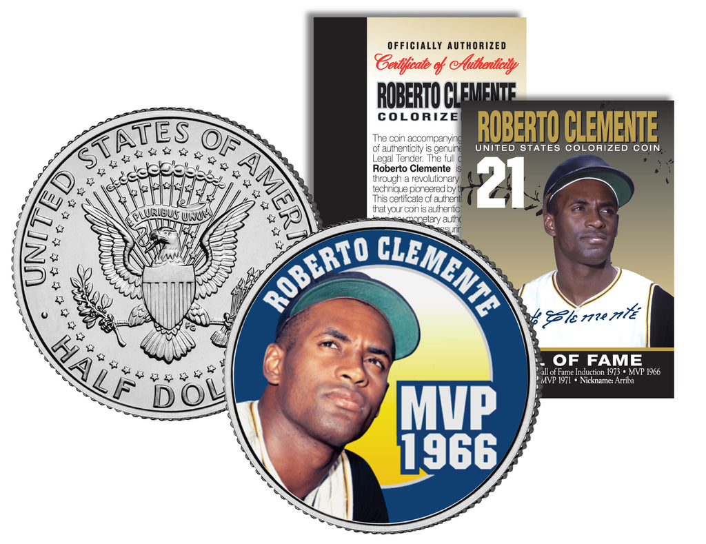 Clemente was a National League, Most Valuable Player in 1966. He died in an aviation accident in 1972, while in route to deliver aid to earthquake victims in Nicaragua. Here is your opportunity to own or to gift the “ROBERTO CLEMENTE – MVP 1966” colorized 1972 JFK Kennedy Half Dollar U.S. Coin, which has been enhanced with a beautifully colorized image by the Merrick Mint. Each coin comes in a premium coin capsule with a full color Certificate of Authenticity. This Legal Tender United States coin has been colorized with an application of special inks directly to the surface of the coin, using a unique and painstakingly multicolor coin process, which achieves a level of detail, color saturation, and durability that is #1 in the coin industry. The result is an everlasting colorized coin collectible of ultra-high quality. The 1972 Kennedy half dollar is a U.S. fifty cent coin with mint marks chosen at random.