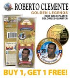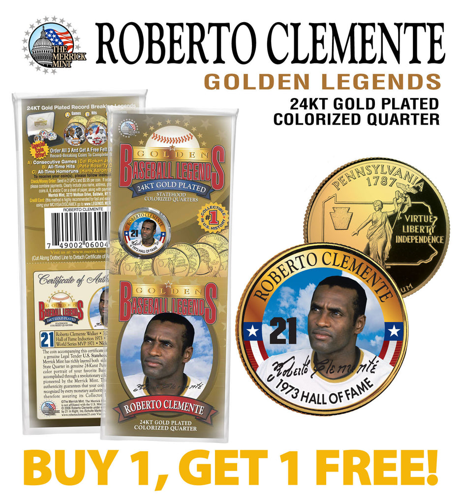 Buy one and get one FREE! This GOLDEN BASEBALL LEGENDS – ROBERTO CLEMENTE “1973 HALL OF FAME 21" coin is a treasured collectible, successfully combining baseball with coin collecting. Here is your opportunity to own or to gift, a beautifully colorized 1999 Pennsylvania Quarter U.S. coin, which has been layered in Genuine 24 Karat Gold, and then enhanced with a beautiful colorized image by the Merrick Mint. This hard-to-find, cello-packed collectible was only available as a NY Daily News newspaper promotion. Each coin comes in a premium coin capsule with a Certificate of Authenticity to guaranty that your coin is authentic and recognized by every monetary authority around the world, assuring its Collector Edition status. This Legal Tender United States coin has been colorized with an application of special inks directly to the surface of the coin, using a unique and painstakingly multicolor coin process, which achieves a level of detail, color saturation, and durability that is #1 in the coin industry. The result is an everlasting colorized coin collectible of ultra-high quality. Each Statehood Quarter coin features an emblematic design of the state on the reverse and colorized player image on the obverse (portrait of George Washington design).