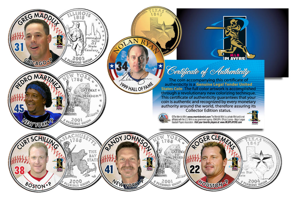 Here is your opportunity to own or to gift the STRIKEOUT KINGS complete 6-coin set of colorized Statehood Quarters U.S. Coins, which have been enhanced with beautifully colorized images by the Merrick Mint. The 6-coin set includes: Nolan Ryan, Randy Johnson, Roger Clemens, Greg Maddux, Pedro Martinez, and Curt Schilling. As a bonus, the NOLAN RYAN coin has been plated with 24K Gold. Each coin comes in a premium coin capsule. The complete 6-coin set comes with a full color Certificate of Authenticity. These Legal Tender United States coins have been colorized with an application of special inks directly to the surface of the coin, using a unique and painstakingly multicolor coin process, which achieves a level of detail, color saturation, and durability that is #1 in the coin industry. The result is an everlasting colorized coin collectible of ultra-high quality. Each Statehood Quarter coin features an emblematic design of the State on the reverse and colorized player image on the obverse (portrait of George Washington design).