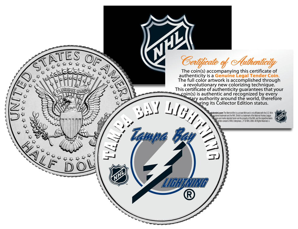 Here is your chance to own a JFK Kennedy Half Dollar U.S. coin that is beautifully colorized with the licensed NHL logo image of your favorite NHL team, the TAMPA BAY LIGHTNING. Each coin is officially licensed and approved by the National Hockey League (NHL). This high-quality genuine Legal Tender U.S. coin has been colorized using a unique painstaking multicolor authentic process by the Merrick Mint. Colorizing coins involves the unique application of special inks directly to the surface of a coin that achieves a level of detail, color saturation, and durability that is #1 in the coin industry. The result is an everlasting colorized coin collectible of ultra-high quality. Each uncirculated coin comes in a premium coin capsule with a NHL Certificate of Authenticity. The Kennedy half dollar is a U.S. fifty cent coin with coin year and mint marks chosen at random.