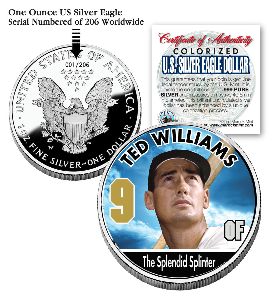 The officially licensed TED WILLIAMS colorized 2006 U.S. Silver Eagle Dollar coin is genuine legal tender struck by the U.S. Mint. It is minted in one full ounce of .999 PURE SILVER and measures a massive 40.6mm in diameter. This brilliant uncirculated silver dollar has been enhanced by a unique colorization process. Each coin is a limited edition and serial numbered of 206 on the coin reverse. Each coin comes in a premium coin capsule with a Certificate of Authenticity. Due to the age of the coin, there may be some toning which is a natural effect of .999 Pure Silver coins.