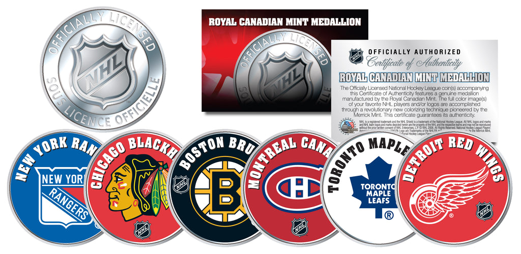 Here is your chance to own the complete 6-medallion set of THE ORIGINAL SIX teams of the NHL. These officially licensed Royal Canadian Mint NHL Medallions are beautifully colorized with the licensed NHL logo images of The Original Six teams that made up the National Hockey League (NHL) for 25 seasons starting in 1942. These six teams are the Boston Bruins, Chicago Black Hawks, Detroit Red Wings, Montreal Canadiens, New York Rangers, and the Toronto Maple Leafs. Each medallion is officially licensed and approved by the National Hockey League (NHL). These officially licensed medallions have been colorized using a unique multicolor authentic process by the Merrick Mint. Colorizing medallions involves the unique application of special inks directly to the surface using a unique and painstakingly multi-color process, that achieves a level of detail, color saturation, and durability that is #1 in the industry. Each medallion comes in a coin capsule. The 6-medallion set comes with a NHL Certificate of Authenticity. Each medallion is about the same size as a U.S. Half Dollar coin and features a NHL logo with English and French wording design on the reverse and a colorized NHL team logo image on the obverse.
