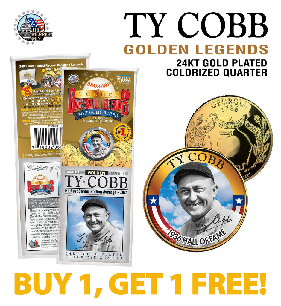 Buy one and get one FREE! This GOLDEN BASEBALL LEGENDS – TY COBB “1936 HALL OF FAME" coin is a treasured collectible, successfully combining baseball with coin collecting. Here is your opportunity to own or to gift, a beautifully colorized 1999 Georgia Quarter U.S. coin, which has been layered in Genuine 24 Karat Gold, and then enhanced with a beautiful colorized image by the Merrick Mint. This hard-to-find, cello-packed collectible was only available as a NY Daily News newspaper promotion. Each coin comes in a premium coin capsule with a Certificate of Authenticity to guaranty that your coin is authentic and recognized by every monetary authority around the world, assuring its Collector Edition status. This Legal Tender United States coin has been colorized with an application of special inks directly to the surface of the coin, using a unique and painstakingly multicolor coin process, which achieves a level of detail, color saturation, and durability that is #1 in the coin industry. The result is an everlasting colorized coin collectible of ultra-high quality. Each Statehood Quarter coin features an emblematic design of the state on the reverse and colorized player image on the obverse (portrait of George Washington design).