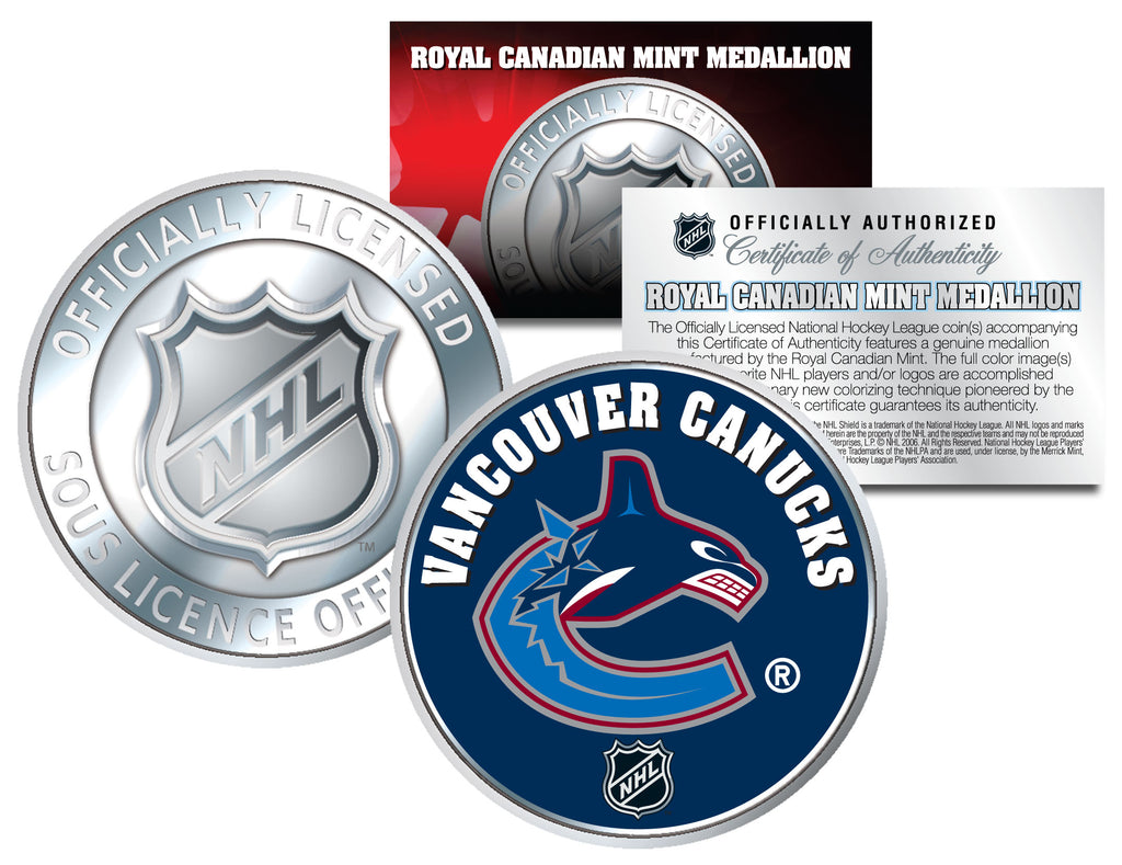 Here is your chance to own an OFFICIALLY LICENSED Royal Canadian Mint NHL Medallion which is beautifully colorized with the licensed NHL logo image of your favorite NHL team, the VANCOUVER CANUCKS. Each medallion is officially licensed and approved by the National Hockey League (NHL). This officially licensed medallion has been colorized using a unique multicolor authentic process by the Merrick Mint. Colorizing medallions involves the unique application of special inks directly to the surface using a unique and painstakingly multi-color process, that achieves a level of detail, color saturation, and durability that is #1 in the industry. Each medallion comes in a coin capsule with a NHL Certificate of Authenticity. Each medallion is about the same size as a U.S. Half Dollar coin and features a NHL logo with English and French wording design on the reverse and a colorized NHL team logo image on the obverse.