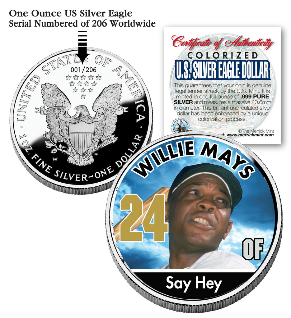 The officially licensed WILLIE MAYS colorized 2006 U.S. Silver Eagle Dollar coin is genuine legal tender struck by the U.S. Mint. It is minted in one full ounce of .999 PURE SILVER and measures a massive 40.6mm in diameter. This brilliant uncirculated silver dollar has been enhanced by a unique colorization process. Each coin is a limited edition and serial numbered of 206 on the coin reverse. Each coin comes in a premium coin capsule with a Certificate of Authenticity. Due to the age of the coin, there may be some toning which is a natural effect of .999 Pure Silver coins.