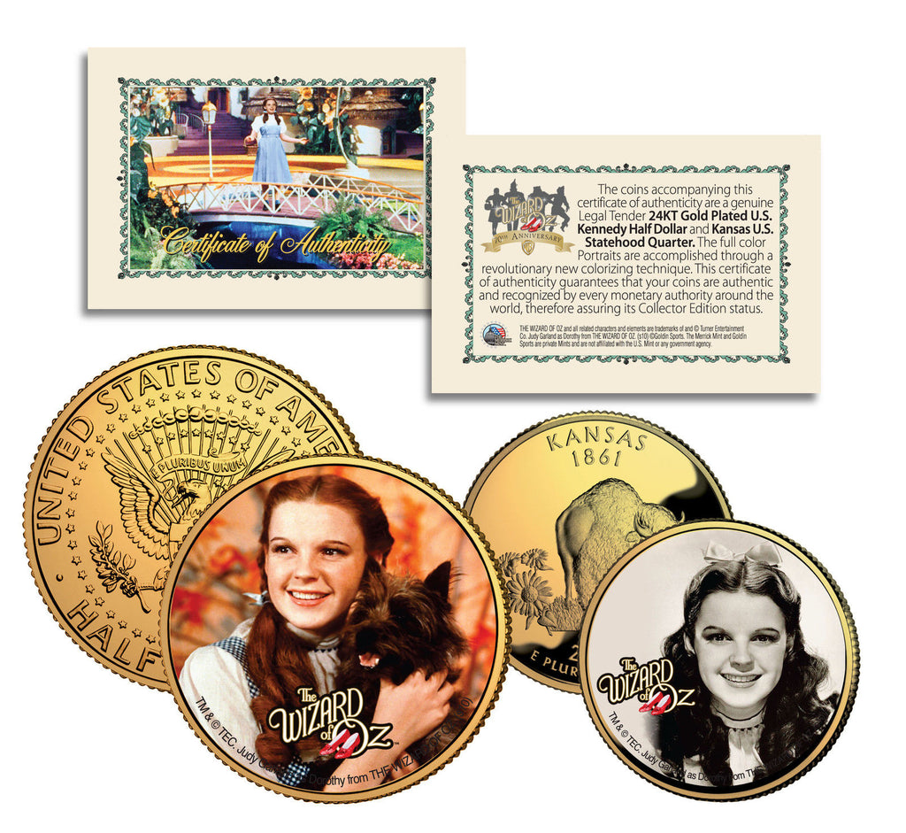 The Wizard of Oz is a 1939 American musical fantasy film starring Judy Garland. This Officially Licensed WIZARD OF OZ SERIES – JUDY GARLAND 2-coin complete set is a treasured collectible, combining the popularity of Wizard of OZ with coin collecting. Coins are Genuine Authentic Legal Tender of the United States, which have been layered in Genuine 24 Karat Gold, and then beautifully enhanced with colorized images. The 2-coin set includes a 24-Karat Gold Plated JFK Kennedy Half Dollar coin with a colorized image of Judy Garland as Dorothy plus a 24-Karat Gold Plated 2005 Kansas Statehood quarter with a colorized image of Dorothy with Toto. Colorizing coins involves the unique application of special inks directly to the surface of a coin that achieves a level of detail, color saturation, and durability that is #1 in the coin industry. The result is an everlasting colorized coin collectible of ultra-high quality. Each coin comes in a premium coin capsule. The set comes with a Certificate of Authenticity to guaranty that your coins are authentic and recognized by every monetary authority around the world, assuring its Collector Edition status.
