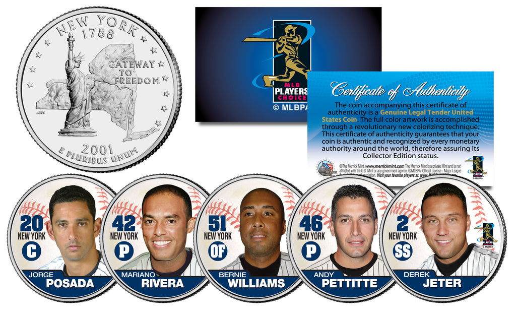 Here is your chance to own a complete set of five (5) colorized 2001 New York Statehood Quarters U.S. Coins featuring the YANKEES FAB FIVE. The 5-coin set includes: Bernie Williams, Jorge Posada, Derek Jeter, Andy Pettitte, Mariano Rivera. These high-quality, genuine Legal Tender United States coins have been colorized using a unique painstaking multi-color authentic process by the Merrick Mint. Colorizing coins involves the unique application of special inks directly to the surface of a coin that achieves a level of detail, color saturation, and durability that is #1 in the coin industry. The result is an everlasting colorized coin collectible of ultra-high quality. Each coin features an emblematic design of New York State on the reverse and colorized images of a YANKEES FAB FIVE on the obverse (portrait of George Washington design). Each coin comes in a premium coin capsule. The 5-coin set comes with a Certificate of Authenticity to guarantee that your coins are authentic and recognized by every monetary authority around the world, assuring its Collector Edition status.