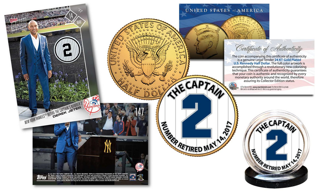 Here is your chance to own both the Sold Out DEREK JETER Topps NOW Officially Licensed Trading Card and the Exclusive Derek Jeter Retirement Captain 24K Gold Plated Kennedy Half Dollar Coin.