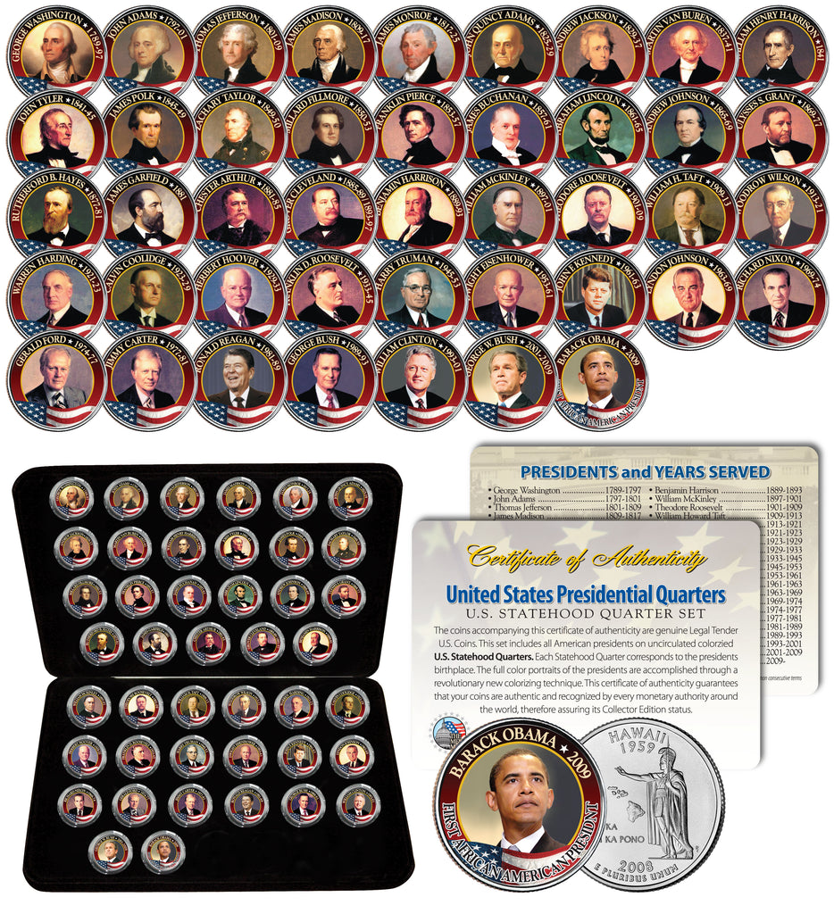Here is your chance to own the United States Presidential Quarters complete set consisting of forty-three (43) beautifully colorized US Statehood Quarters Coins featuring all 43 United States Presidents. Each President coin is matched to the statehood quarter of his birthplace. Each coin comes in a premium coin capsule. Each set comes with a deluxe felt coin display metal box valued at $24.95. Each set comes with a Certificate of Authenticity to guarantee that your coins are authentic and recognized by every monetary authority around the world, assuring its Collector Edition status. These high-quality, genuine Legal Tender United States coins have been colorized using a unique painstaking multicolor authentic process by The Merrick Mint. Colorizing coins involves the unique application of special inks directly to the surface of a coin that achieves a level of detail, color saturation, and durability that is #1 in the coin industry. The result is an everlasting colorized coin collectible of ultra-high quality