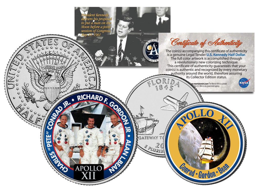 This “APOLLO XII” 2-coin complete set is a treasured collectible. These coins are Genuine Authentic Legal Tender of the United States, which have been beautifully enhanced with colorized images of APOLLO XII Astronaut Crew and mission insignia. The 2-coin set includes a colorized JFK Kennedy Half Dollar coin plus a colorized 2004 Florida Statehood quarter. Each coin comes in a premium coin capsule. The set comes with a Certificate of Authenticity to guarantee that your coins are authentic and recognized by every monetary authority around the world, assuring its Collector Edition status. Colorizing coins involves the unique application of special inks directly to the surface of a coin that achieves a level of detail, color saturation, and durability that is #1 in the coin industry. The result is an everlasting colorized coin collectible of ultra-high quality.