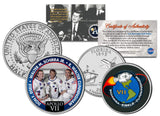 This “APOLLO VII” 2-coin complete set is a treasured collectible. These coins are Genuine Authentic Legal Tender of the United States, which have been beautifully enhanced with colorized images of APOLLO VII Astronaut Crew and mission insignia. The 2-coin set includes a colorized JFK Kennedy Half Dollar coin plus a colorized 2004 Florida Statehood quarter. Each coin comes in a premium coin capsule. The set comes with a Certificate of Authenticity to guarantee that your coins are authentic and recognized by every monetary authority around the world, assuring its Collector Edition status. Colorizing coins involves the unique application of special inks directly to the surface of a coin that achieves a level of detail, color saturation, and durability that is #1 in the coin industry. The result is an everlasting colorized coin collectible of ultra-high quality.
