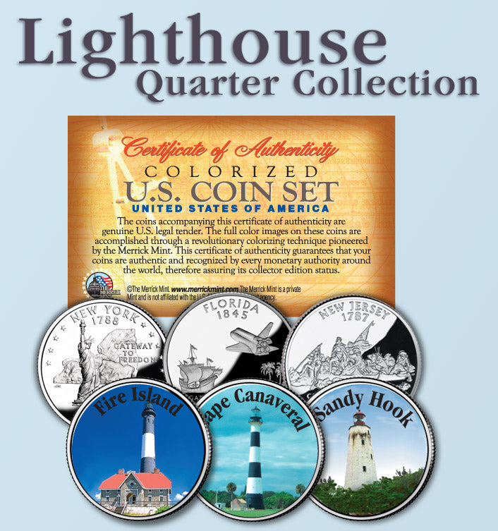These treasured collectibles have successfully combined historic LIGHTHOUSES with coin collecting. Here is your chance to own a set of three (3) beautifully colorized US Statehood Quarters Coins featuring three historic LIGHTHOUSES: Fire Island (NY), Cape Canaveral (FL), Sandy Hook (NJ). Each collectible Lighthouse coin is matched to its state’s Statehood Quarter. These high-quality, genuine Legal Tender United States coins have been colorized using a unique painstaking multicolor authentic process by The Merrick Mint. Colorizing coins involves the unique application of special inks directly to the surface of a coin that achieves a level of detail, color saturation, and durability that is #1 in the coin industry. The result is an everlasting colorized coin collectible of ultra-high quality. Each coin comes in a premium coin capsule with a Certificate of Authenticity.