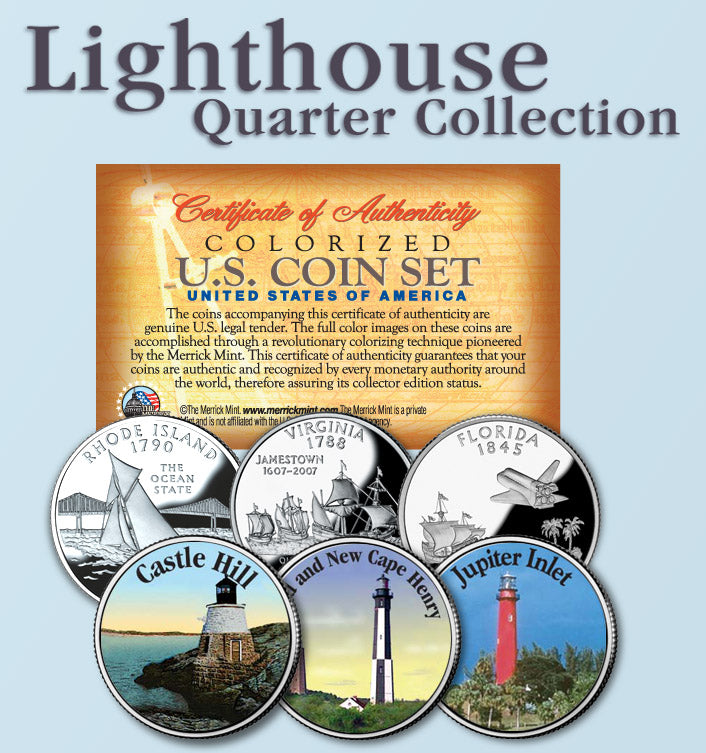 These treasured collectibles have successfully combined historic LIGHTHOUSES with coin collecting. Here is your chance to own a set of three (3) beautifully colorized US Statehood Quarters Coins featuring three historic LIGHTHOUSES: Castle Hill (RI), Old and New Cape Henry (VA), Jupiter Inlet (FL). Each collectible Lighthouse coin is matched to its state’s Statehood Quarter. These high-quality, genuine Legal Tender United States coins have been colorized using a unique painstaking multicolor authentic process by The Merrick Mint. Colorizing coins involves the unique application of special inks directly to the surface of a coin that achieves a level of detail, color saturation, and durability that is #1 in the coin industry. The result is an everlasting colorized coin collectible of ultra-high quality. Each coin comes in a premium coin capsule with a Certificate of Authenticity.