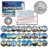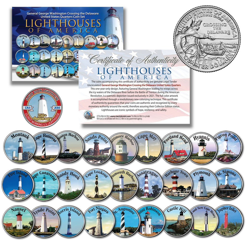 These treasured collectibles have successfully combined historic LIGHTHOUSES with coin collecting. Here is your chance to own a complete set of twenty-eight (28) beautifully colorized Washington Crossing the Delaware Quarters featuring historic LIGHTHOUSES in the United States. This one-year-only design, featuring General Washington leading his troops across the icy waters of the Delaware River before the Battle of Trenton during the American Revolution, is a patriotic depiction issued exclusively in 2021. These high-quality, genuine Legal Tender United States coins have been colorized using a unique painstaking multicolor authentic process by The Merrick Mint. Colorizing coins involves the unique application of special inks directly to the surface of a coin that achieves a level of detail, color saturation, and durability that is #1 in the coin industry. The result is an everlasting colorized coin collectible of ultra-high quality. Each coin comes in a premium coin capsule with a Certificate of Authenticity. REGULAR PRICE of this 28-coin set is $129.95. GREAT SAVINGS BY BUYING HERE NOW!!!