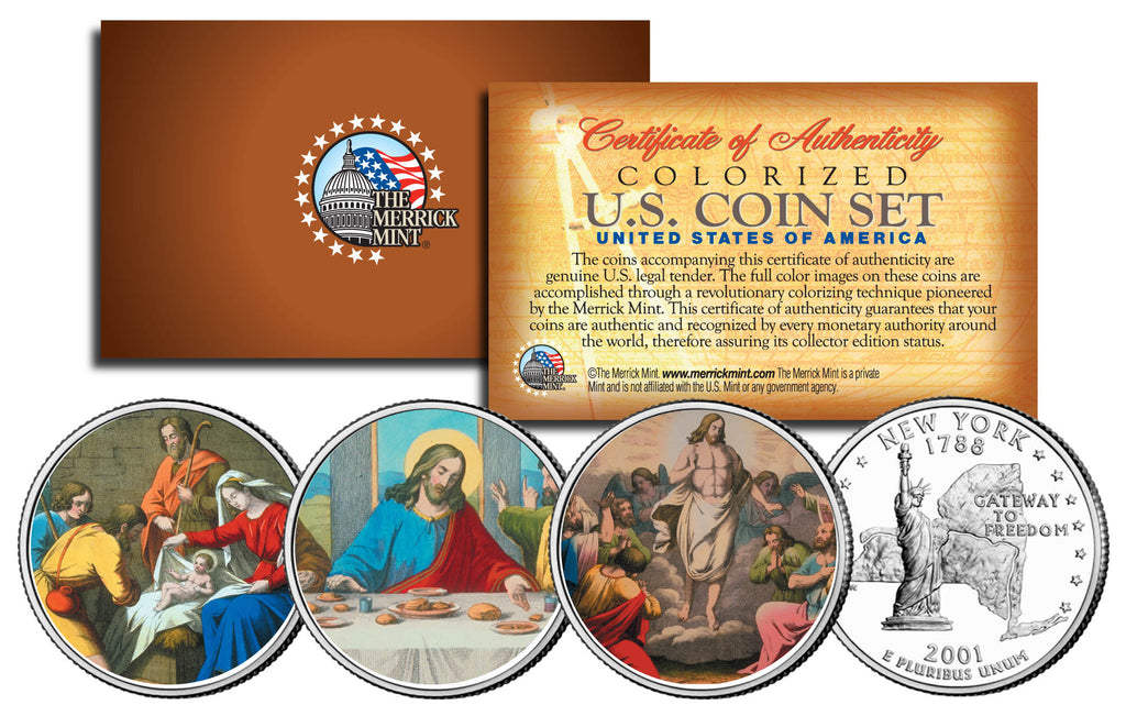 Here is your chance to own a complete set of three (3) colorized 2001 New York Statehood Quarters U.S. Coins of JESUS CHRIST. The 3-coin set includes: a “JESUS CHRIST – NATIVITY” coin, a “JESUS CHRIST – LAST SUPPER” coin, and a “JESUS CHRIST - RESURRECTION” coin. These high-quality, genuine Legal Tender United States coins have been colorized using a unique painstaking multicolor authentic process by the Merrick Mint. Colorizing coins involves the unique application of special inks directly to the surface of a coin that achieves a level of detail, color saturation, and durability that is #1 in the coin industry. The result is an everlasting colorized coin collectible of ultra-high quality. Each coin features an emblematic design of New York State on the reverse and colorized images of JESUS CHRIST on the obverse (portrait of George Washington design). Each coin comes in a premium coin capsule. The 3-coin set comes with a Certificate of Authenticity to guarantee that your coins are authentic and recognized by every monetary authority around the world, assuring its Collector Edition status.
